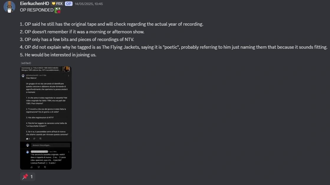 On December 3rd, Soverini uploaded an extended version of the recording titled "ITALO DISCO 1985 DISCO MUSIC Bologna 1985 unknow duo NTV nuovatelevisione Bologna". In the description, Soverini tagged the performing duo as "Le Giacchette Volanti" ("The Flying Jackets").
